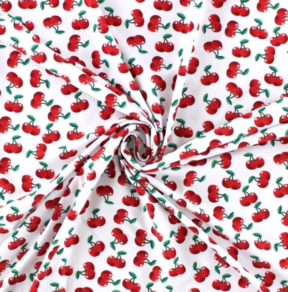Hochwertiger Baumwolljersey, der sich ideal für vielfältige Projekte in den Bereichen Bekleidung und Wohnkultur eignet. Dieser charmante Jersey-Stoff in elegantem Weiß, verziert mit einem entzückenden Kirschen-Muster, misst 150 cm in der Breite. Mit einer angenehmen Zusammensetzung von 95% Baumwolle und 5% Elastan bietet er eine optimale Dehnbarkeit und ist somit perfekt geeignet für Alltagskleidung, Sweatshirts, T-Shirts, Baby- und Kleinkindbekleidung sowie für kreative Anwendungen im Bereich Hobbys und Handwerk.