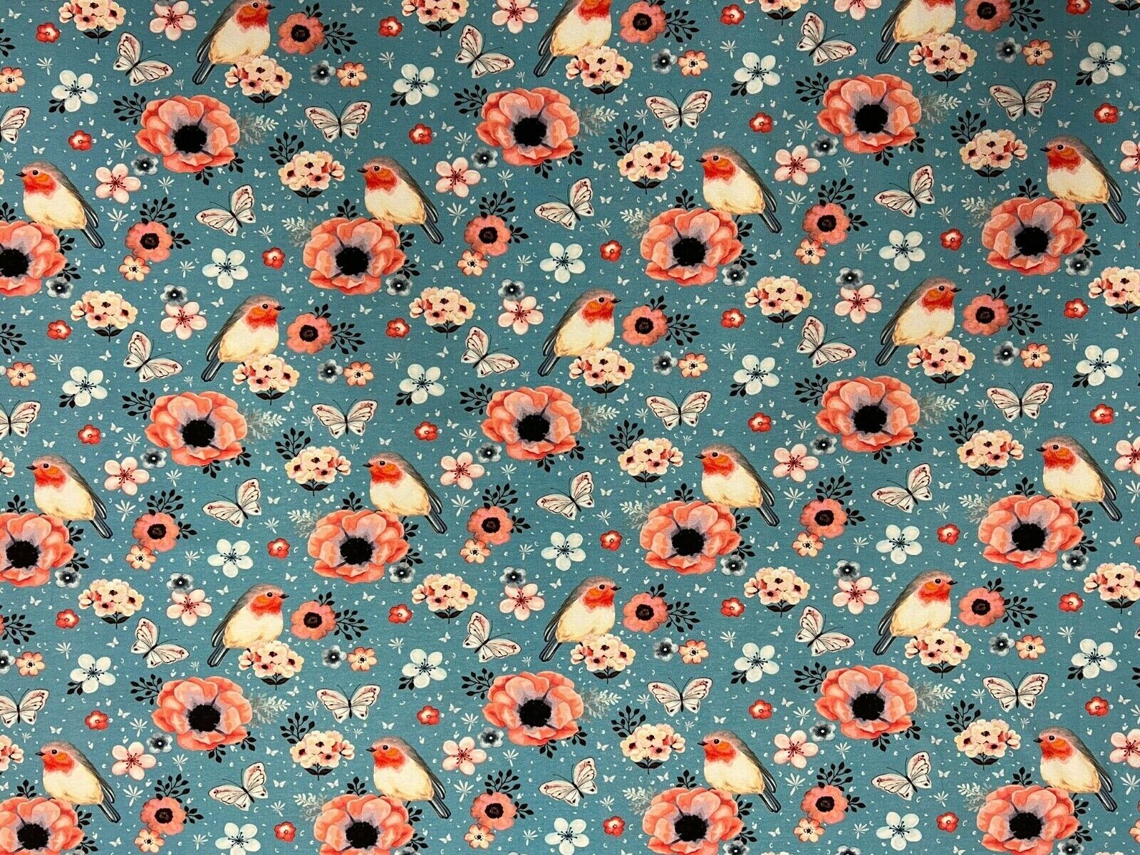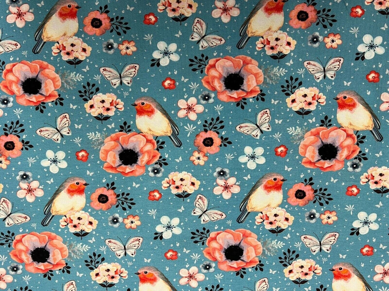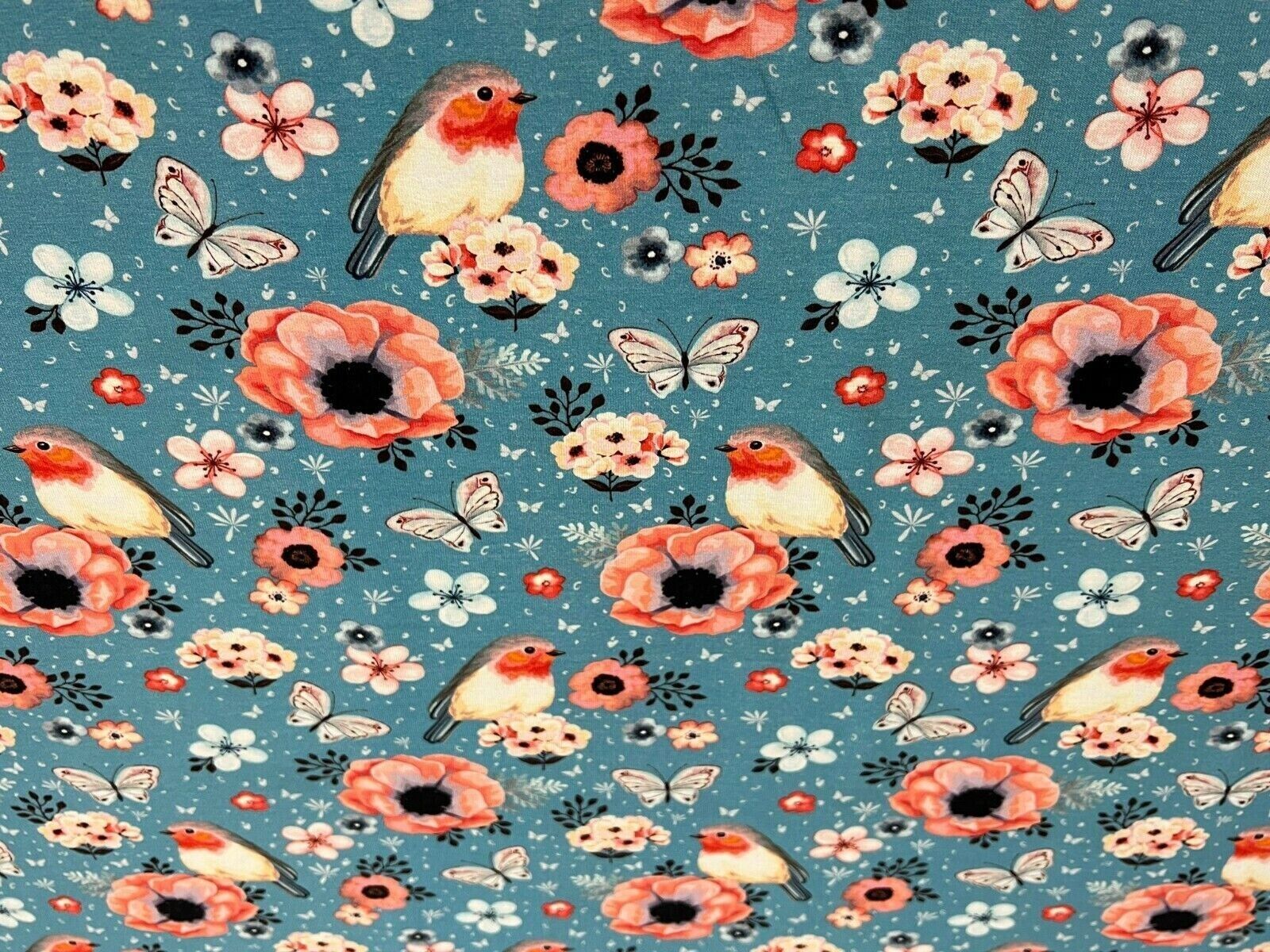 Jerseystoff Baumwolljersey Vögel Rotkehlchen mit Blumenmuster in der Farbe petrol